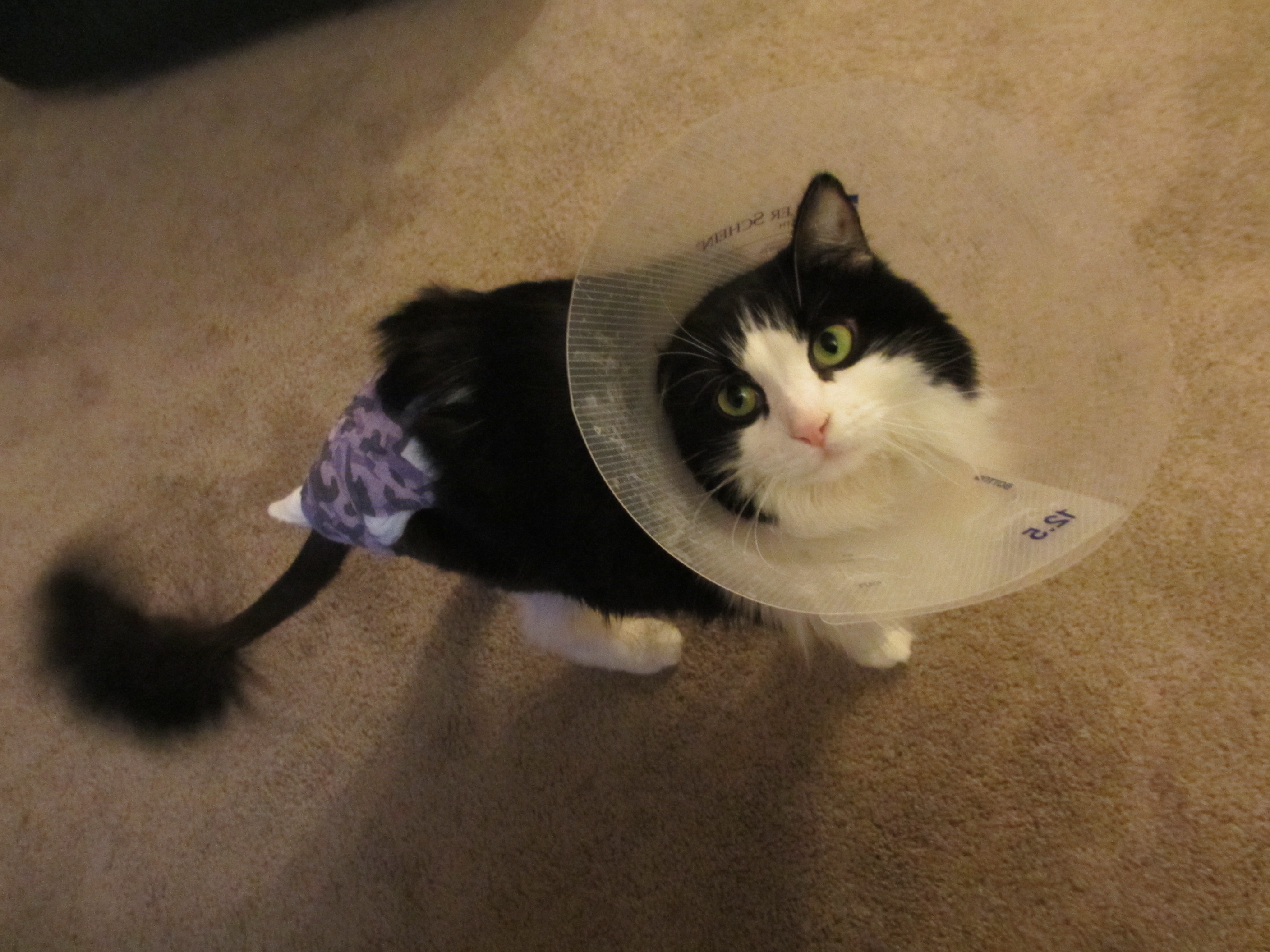 Lastly I will leave you with two things… one – a picture of my cat, since she seems to be starring in my blog lately.  She’s doing a lot better, they no longer have us coming in daily to change her bandage, we just have her in onesies at home now.  It’s really cute, except she knows how to get herself out of them so we have to keep an eye on her.