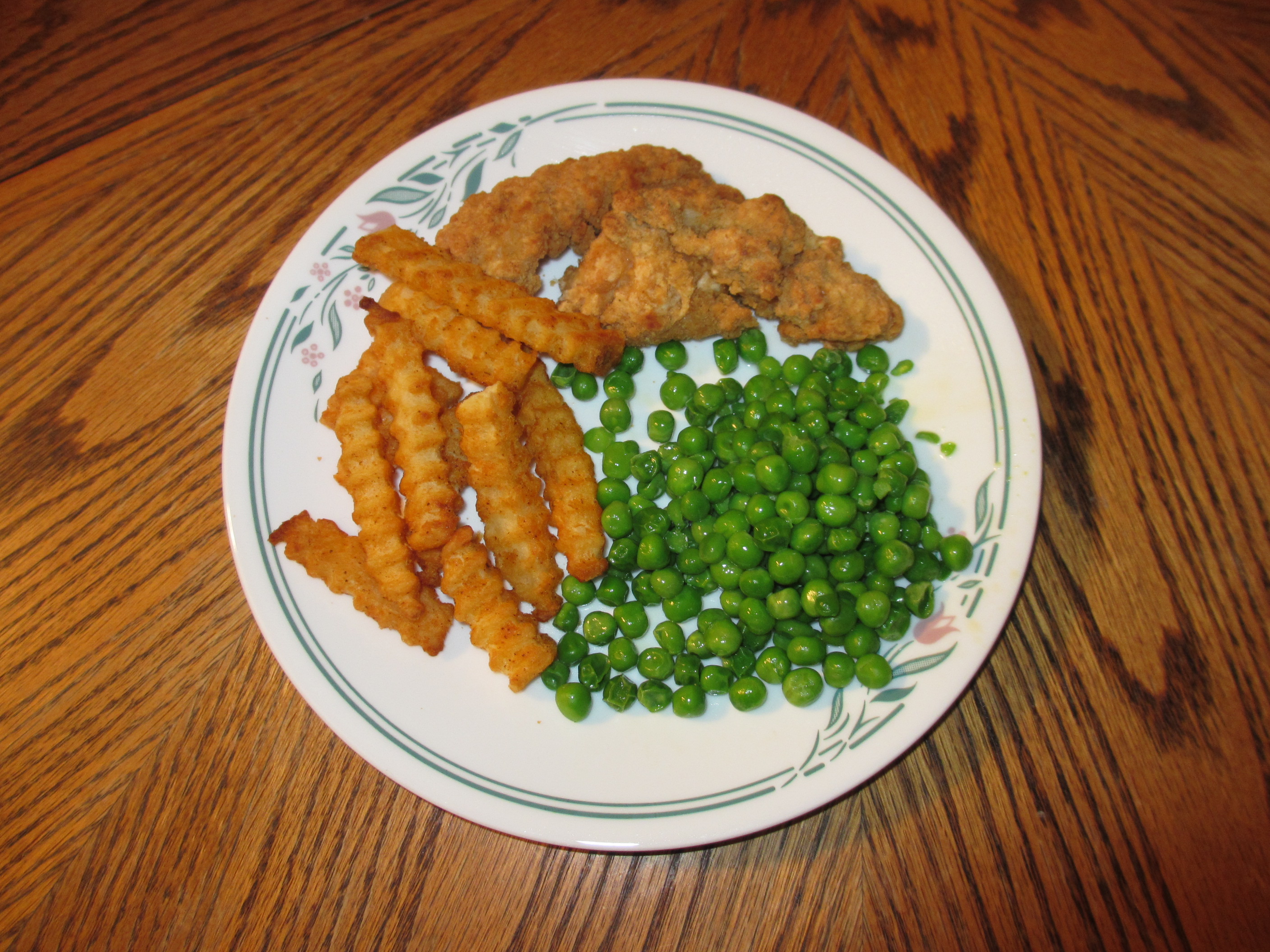 This is a great example of one of my “go-to” meals when I don’t feel like thinking and I don’t feel like following a recipe.  I always have frozen chicken strips (both regular and BBQ), frozen vegetables of all kinds, and frozen french fries (either regular or sweet potato) on hand.  They cook up quickly for a nice balanced meal!  The chicken and the fries are a bit high in sodium, but frozen vegetables are typically very low in sodium.  Sometimes I’ll whip up some pasta for a side instead, or I’ll just have some chicken as a snack.