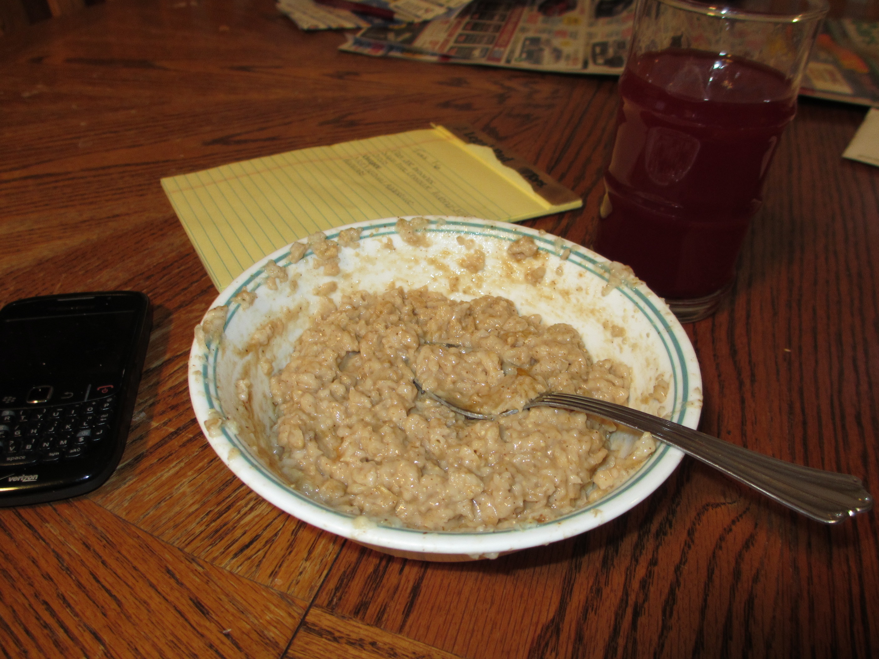 I did actually get a picture of what I had for breakfast today!  I made regular oatmeal and added a tablespoon of natural peanut butter, a tablespoon of brown sugar, and close to a teaspoon of cinnamon.  No matter what I do, my oatmeal always explodes in the microwave – you can see the evidence on the bowl!  I paired my yummy oatmeal with a glass of V8 Fusion Concord Grape Raspberry, YUM!!!  I love the taste of grape juice, and this juice gets an extra bang for you buck – each 8 ounce glass has a serving of fruit and a serving of vegetables!  You can’t taste anything but yummy grapes.