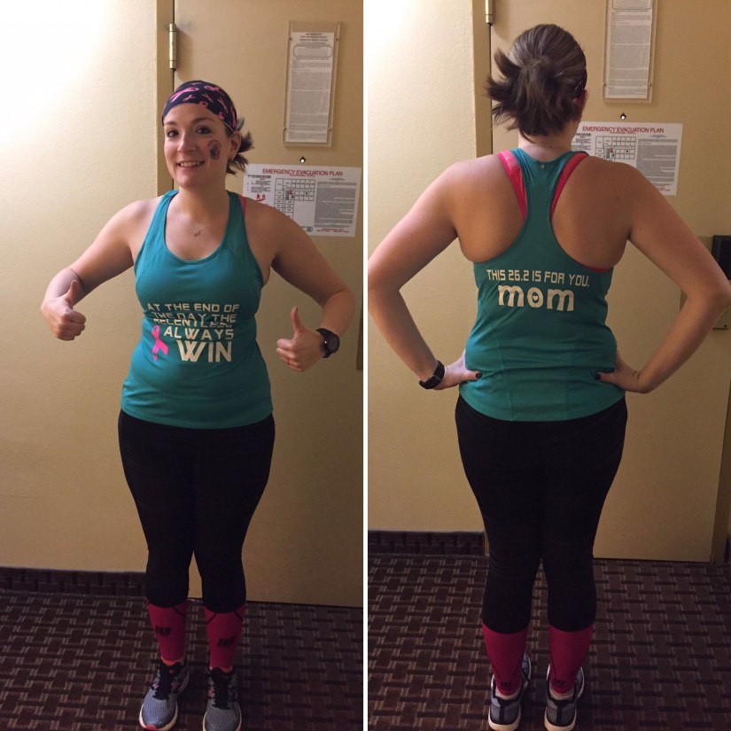 We pulled up to the hotel and grabbed all of our bags out of the car so that valet could park it for us. We headed up to our room and promptly ordered some cheese pizza to be delivered. I started unpacking my bags and re-organizing everything, trying to make things as easy for myself as possible. We discussed race morning plans – what time we would get up, who needed to shower, what we were going to eat, when we were going to head out to the race. Paula and I put together our flat runners. We spent the entire night smiling and laughing with each other about so many things: Christine and I looked like twins when we took off our shirts and were both wearing white tank tops and dark wash jeans, Paula commented that all she had to do to get to the race was walk outside and apparently I thought that was super funny, I thought that the gummy sour bats we got in our swag bags smelled a little bit like feet, and when I randomly blurted out “I’m running a freakin’ marathon tomorrow,” without skipping a beat Paula followed it up with, “Yup, and you’re over there eating your foot bat.” I laughed so many times that night and so hard that I cried. I don’t know what I would do without those girls!