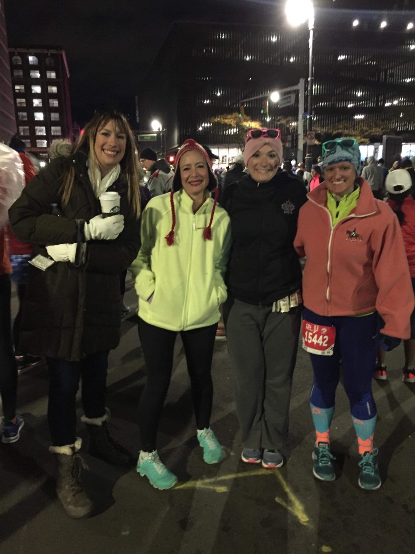 Of course I didn’t sleep well that night. I kept waking up wondering what time it was – the clock in our room was wrong, and my phone and watch were both charging. I finally got up to check the time and use the bathroom and it was 4:50am – our alarm was set for 4:55am. I got up and got ready. I drank my Propel and ate my breakfast of Frosted Flakes and hard boiled eggs. We got dressed in our running gear. Our friends met us and hung out with us in our room to stay warm. At about 6:20 we headed downstairs to check our bags and then walk to the race. Like Paula joked the night before, we were so close to the race start – only a street away. We made our last minute porta-potty stops, got everyone to their corrals, and hugged each other offering words of encouragement and “I love you’s”. Christine and I left Paula and jogged to my corral.