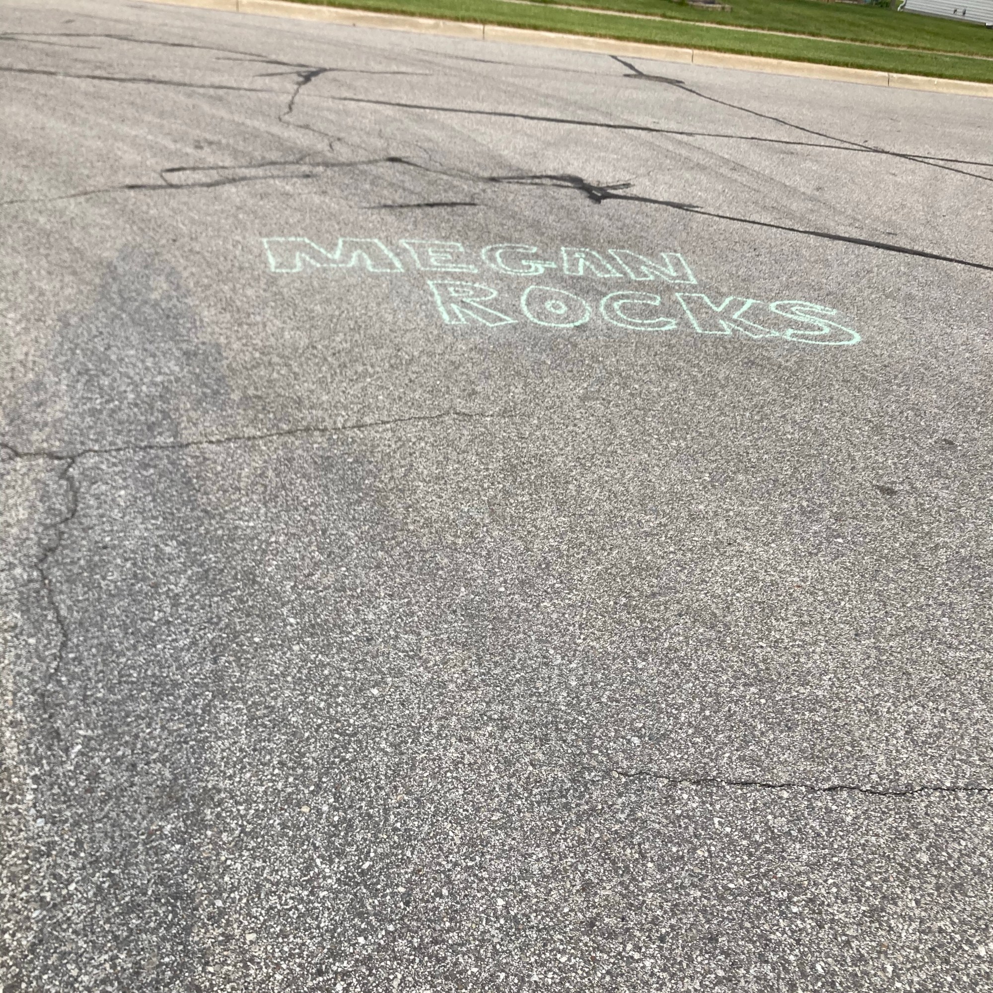 Not long into that third loop, I saw another familiar car. Another friend of mine pulled into a driveway, turned around and parked, and jumped out of her car and started cheering for me. Again I felt tears coming to my eyes. I thanked her for coming out and continued running. She followed me in her car for a bit and took some more pictures. She then said she was going to run a few miles on her own (in a different location) and I told her to park at my house if she wanted to. She took off and I continued my third loop. I discovered even more sidewalk chalk messages. It started to feel more like a real race.