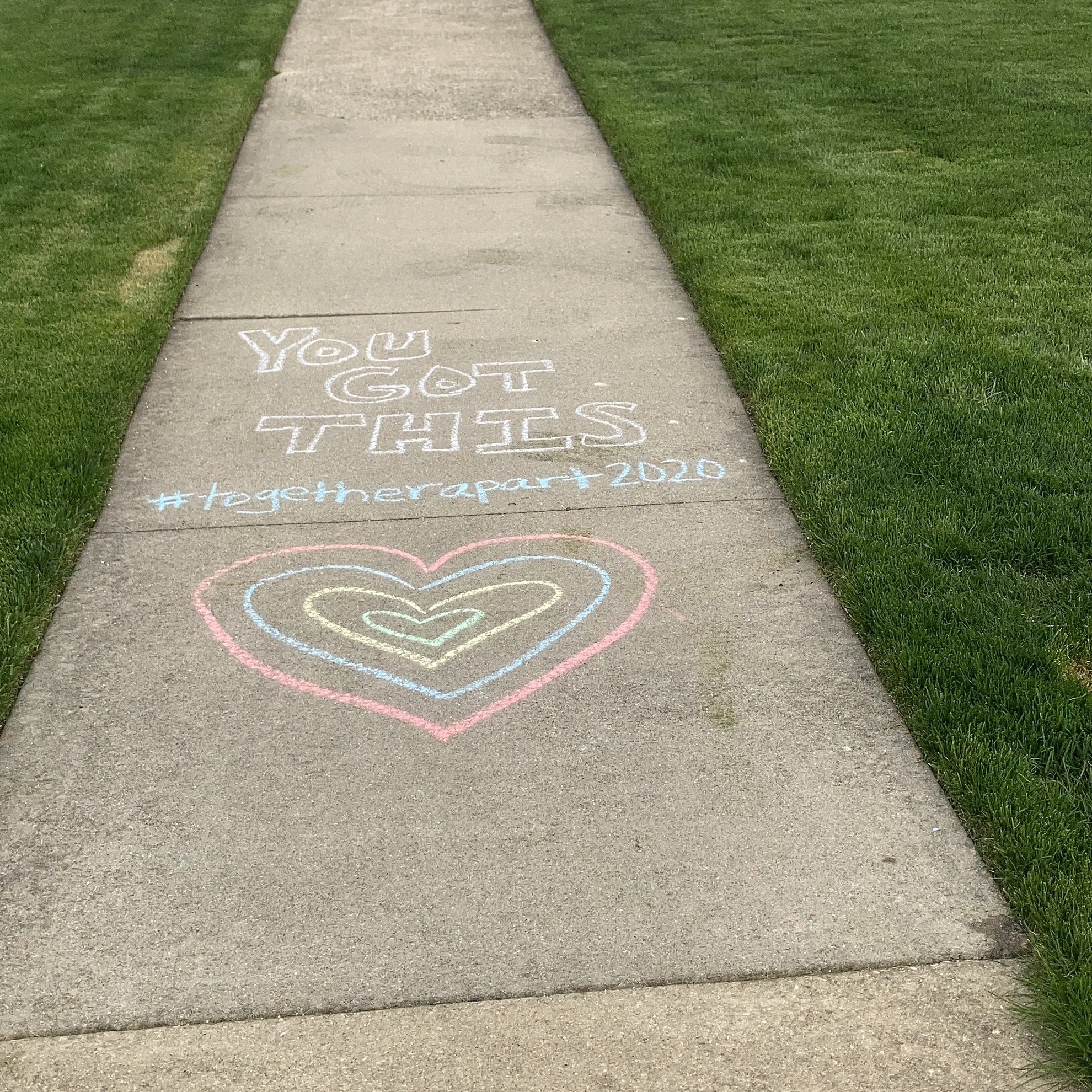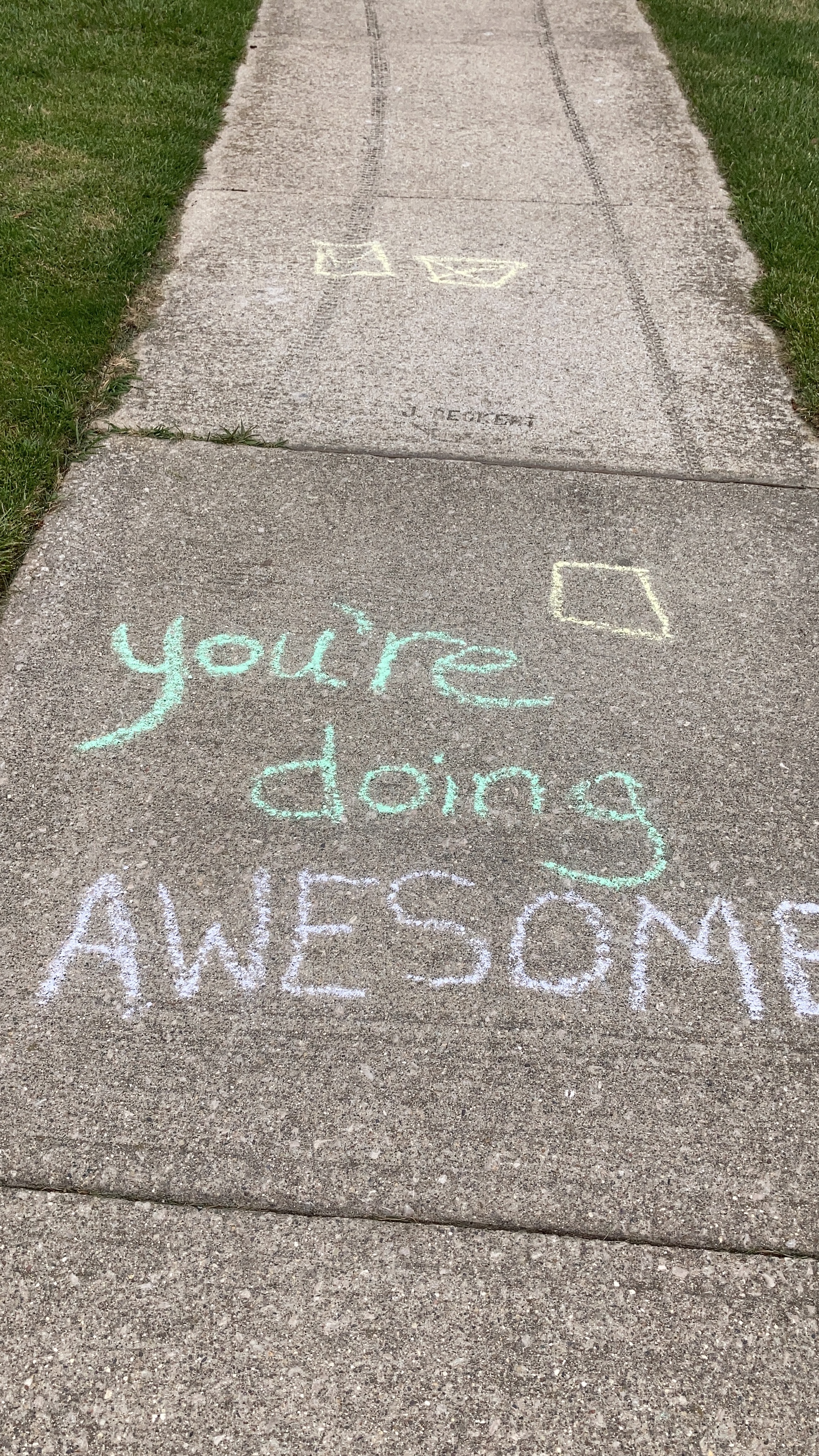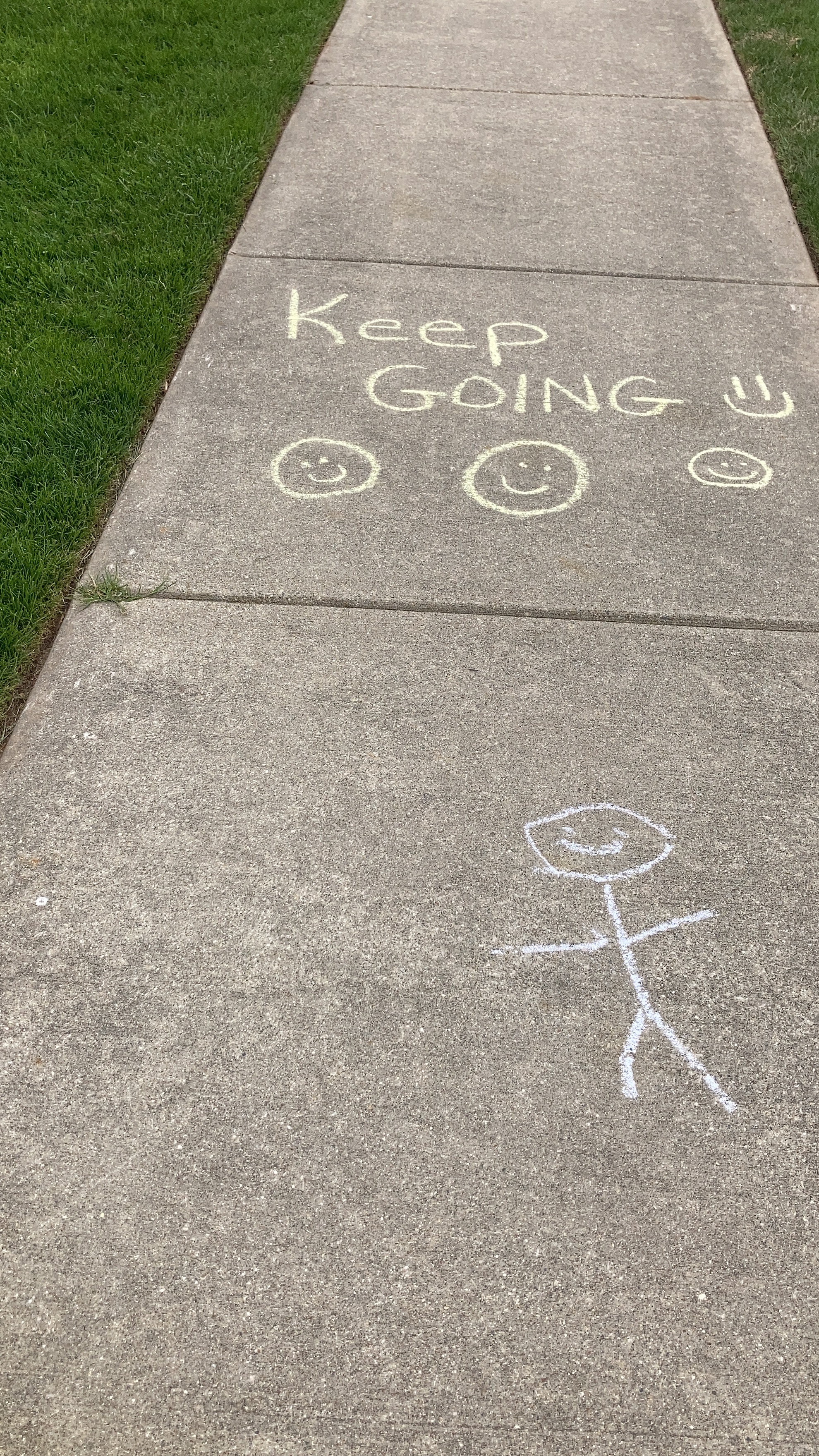 As I approached my house for the 4th time, I saw my friend that had gone for her run standing in my yard taking pictures of me. She cheered me on, saying “ONLY A 5k TO GO!” and asked me if I wanted a McDonald’s Coke. I said YES! And that kept my momentum going for a while. I decided on this final loop to make sure I took pictures of all of the sidewalk chalk drawings, and I did. Two of my friends found me again, with a little less than a mile left to go.