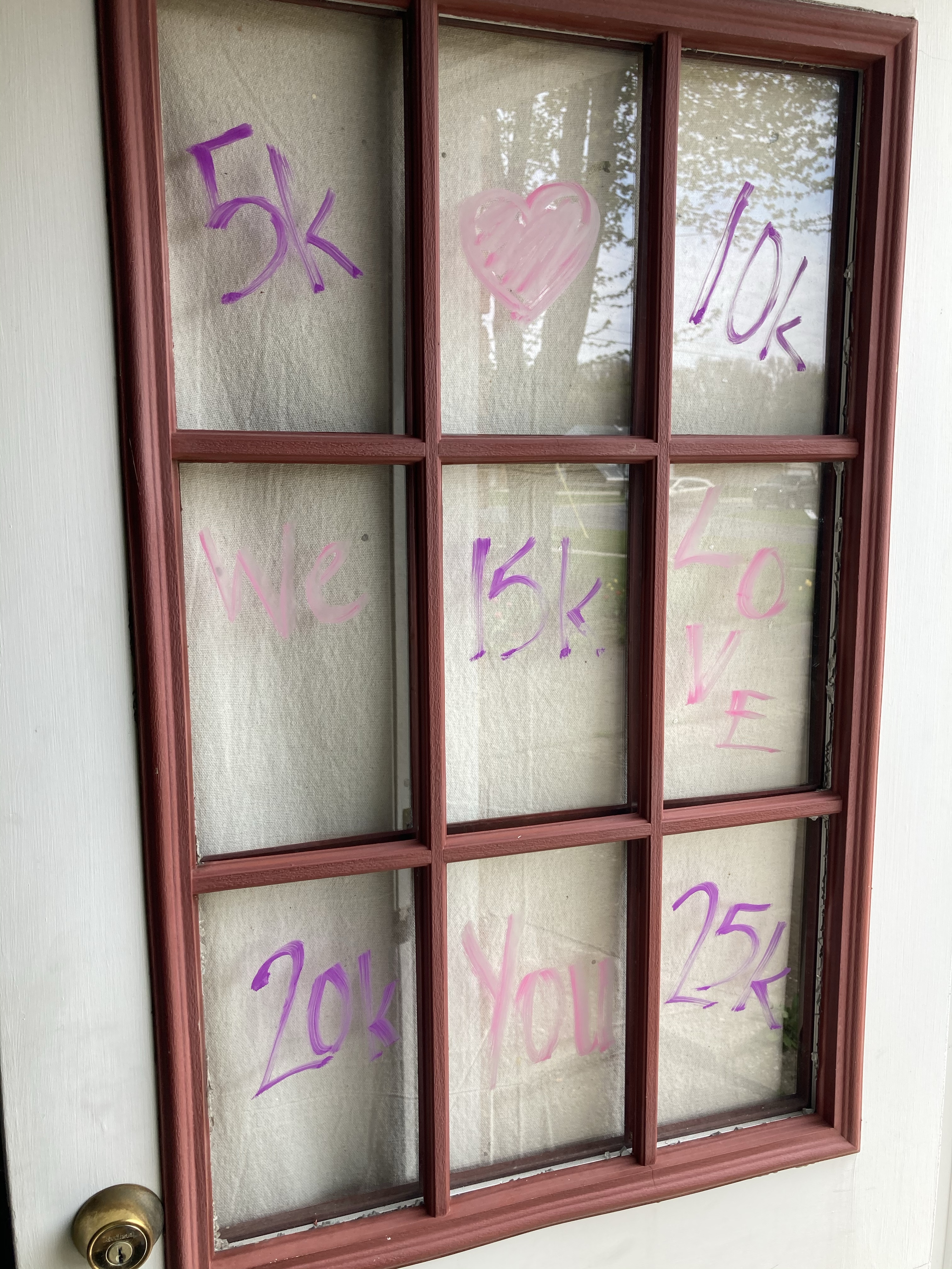 I had decided that I would do 5k loops – 5 of them – so that I was always close to home in case something were to happen to me. I had LiveTrack from my watch sent out to my friends and husband so that they could see how I was doing and also would know where I was if anything were to happen. As I made my way along that first 5k route, I commented to myself what a perfect day it was. I was so glad in that moment that I had waited to run on Sunday. As I ran alone, I decided to change my original plan to run the same 5k loop 5 times, and instead I would run two different loops that were both about a 5k. Not long after I had that thought I realized that the weird sound I had heard that morning was my friend writing on my window! That thought made me smile, that someone had been “with me” as I got ready for the race.