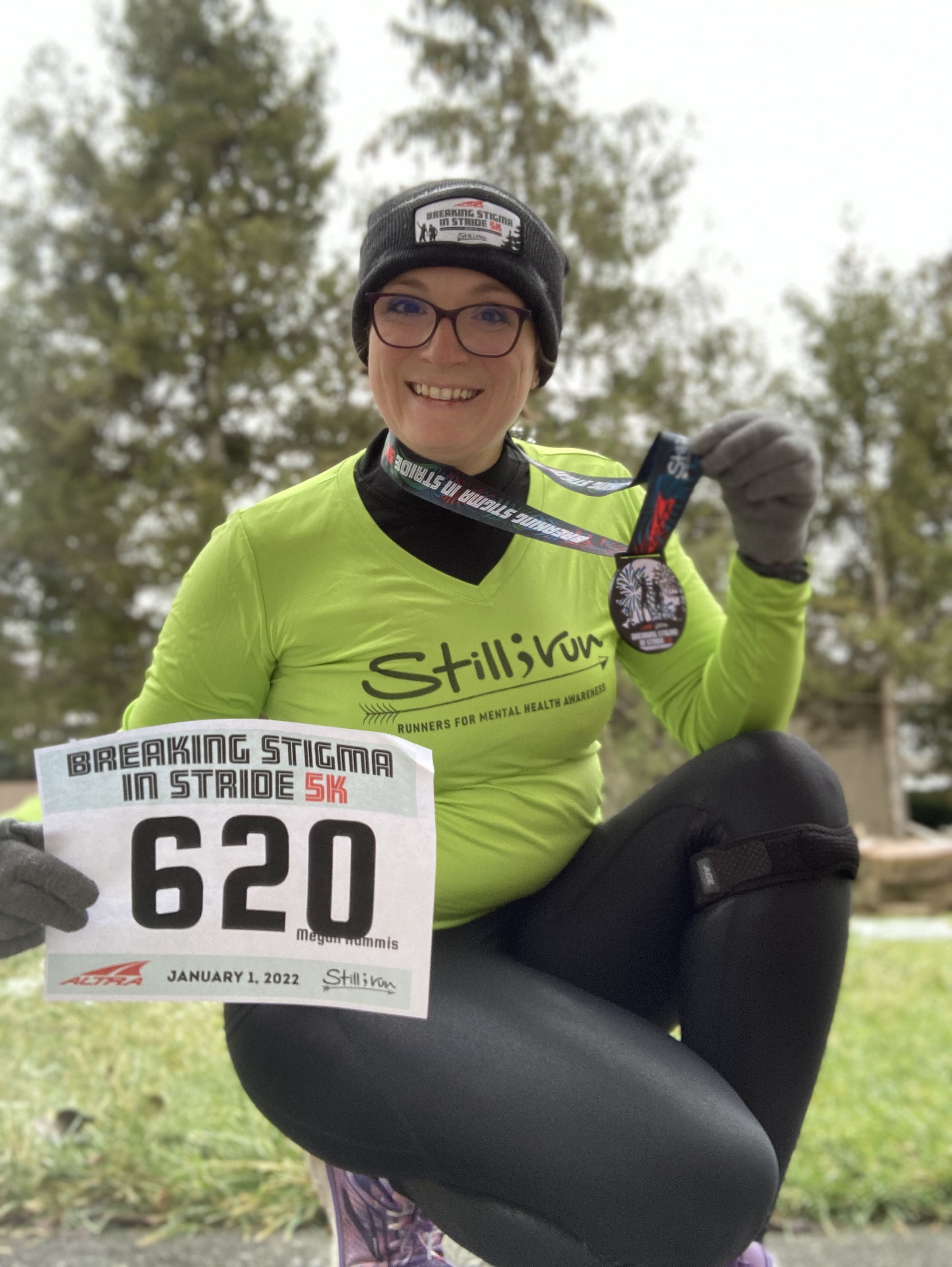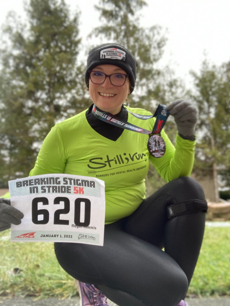 I also completed my first run of the year yesterday! I ran a virtual race, Breaking Stigma in Stride 5k. This race, hosted by Still I Run and Altra Running, is meant to start the year off on the right foot by talking about and running for your mental health in order to break the stigma. I was chosen to be a Still I Run Ambassador for 2022, so I proudly donned some of my gear, hit the pavement, and shared about this wonderful group that I am part of. I will share even more with you about this amazing mental health/running community as the year goes on. I ran 3.11 miles in 39:18 – my goal was to finish in under 40 minutes. I also did a magic mile for my 2nd mile of the race. My magic mile time was 10:42 and will help me with my training goals coming up. I plan to try to do a magic mile at least once a month in 2022. My next race will be an in person race on February 5th – the 2022 Winterlaufe 8k will be my 100th (in person/official) race!