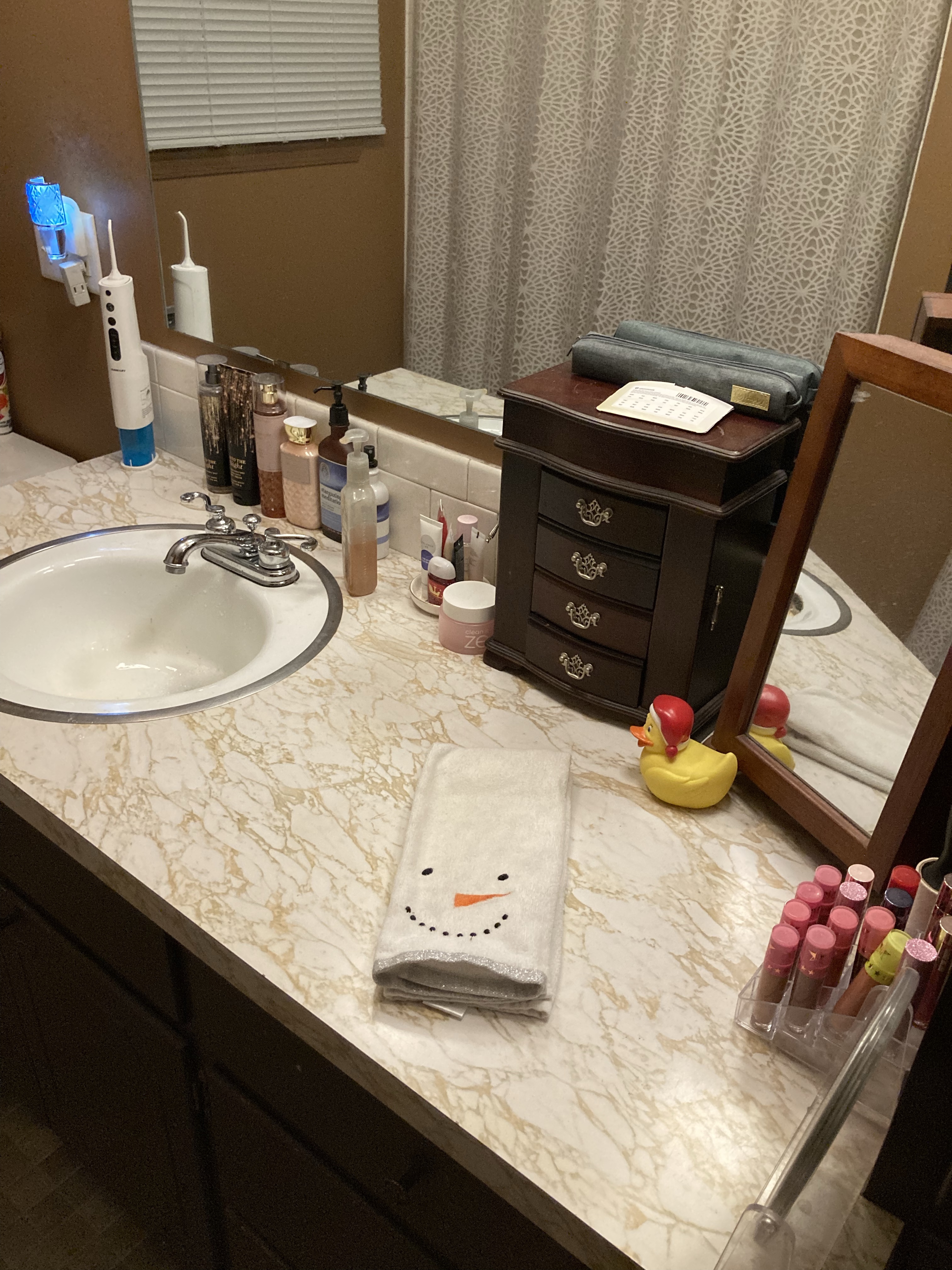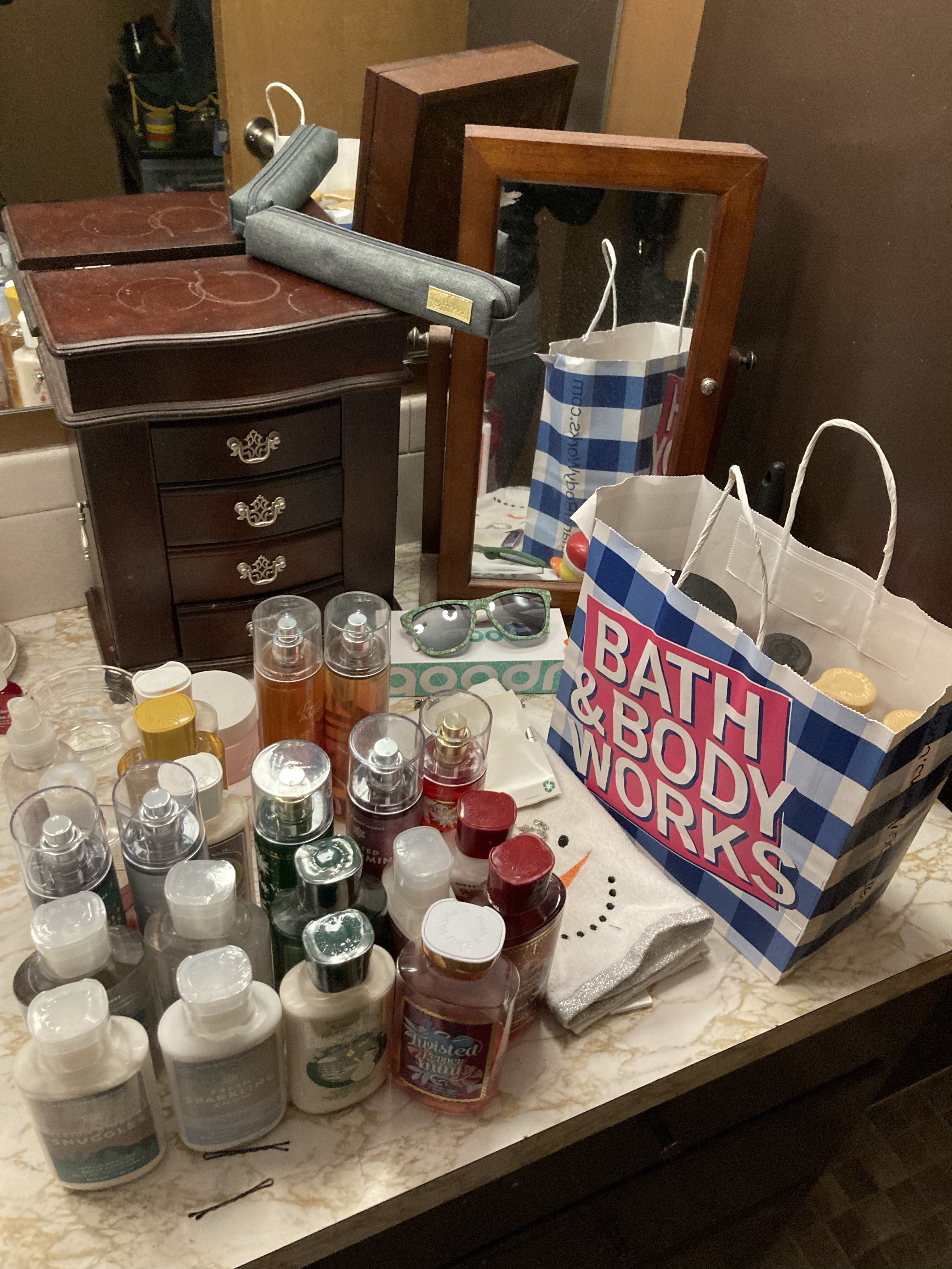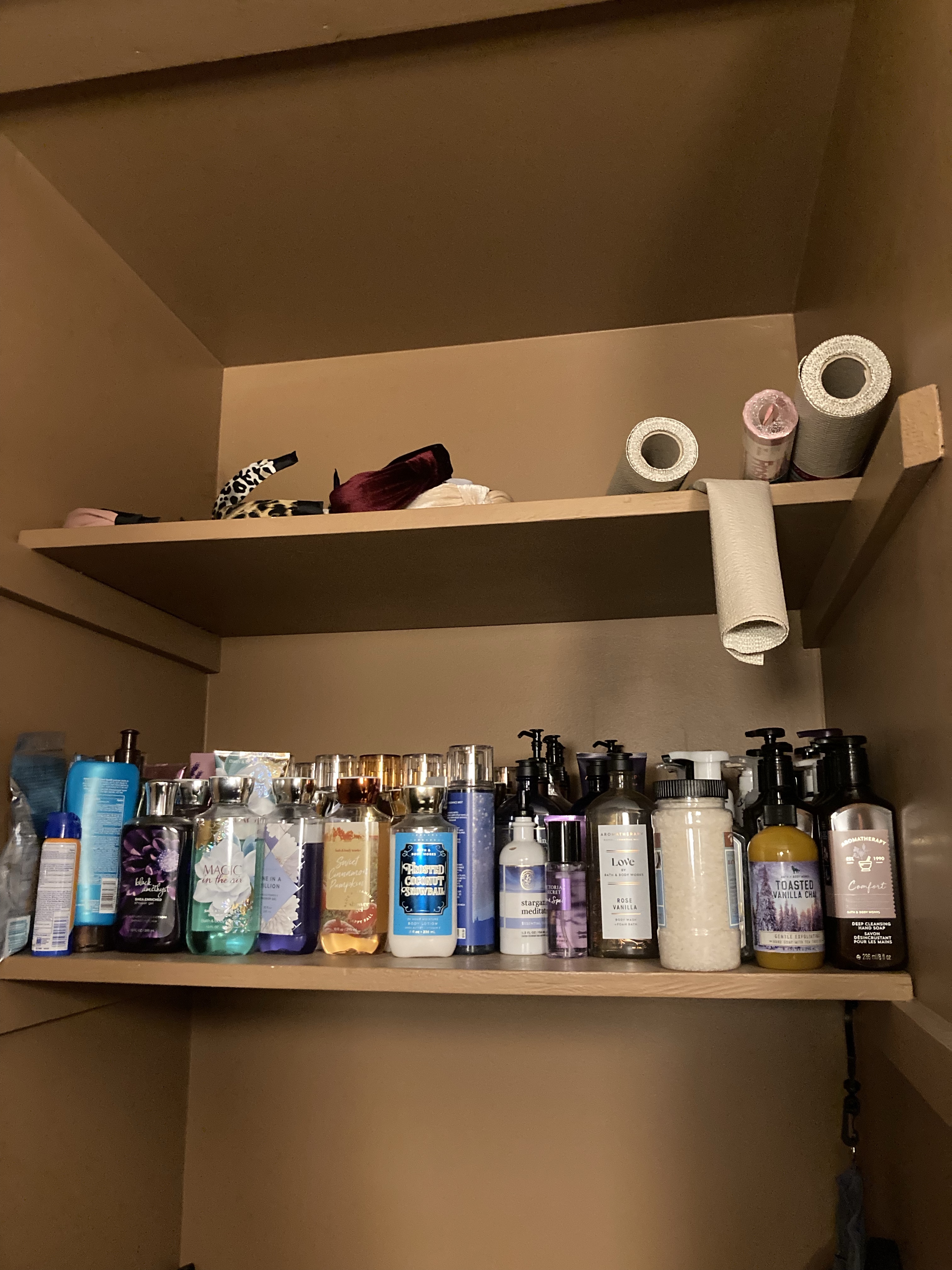 Something else I am working on this month is getting my house more organized, cleaned up and decluttered. With the help of my friend and some googling, I put together a spreadsheet of different tasks to complete over the next month to help me get started. I actually found a lot of different calendars, lists, etc. for cleaning that I think I will use throughout the year to guide me and change things up to keep our house tidy. My first project was to declutter and reorganize the shelves in my bathroom where I keep my (really ridiculous) collection of Bath and Body Works soaps and lotions.