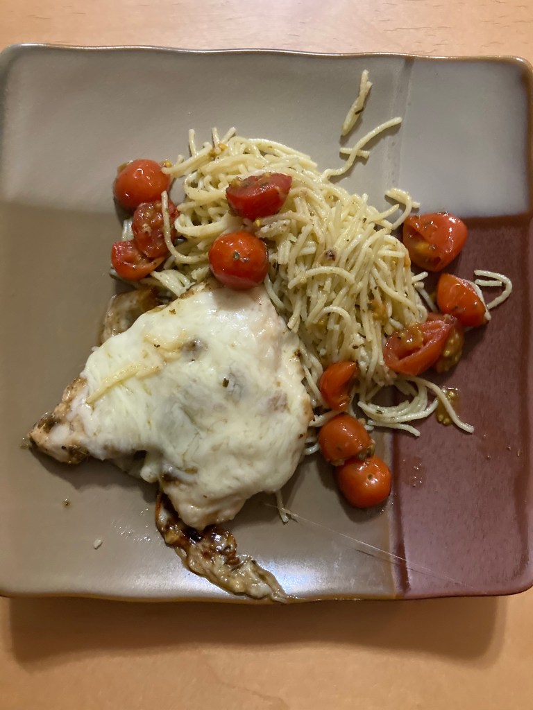 We didn’t have luck finding fresh basil at the store, so we opted for pesto instead. While the chicken was baking, we tossed the tomatoes with vinegar, oil, garlic, Italian seasoning and pesto. When it was time to flip the chicken, we added the tomato mixture to the baking sheet. Meanwhile, we cooked some angel hair spaghetti on the stovetop. When the pasta was cooked, we tossed that with more olive oil, garlic and pesto.