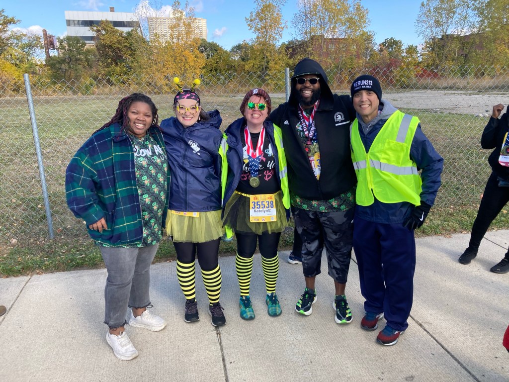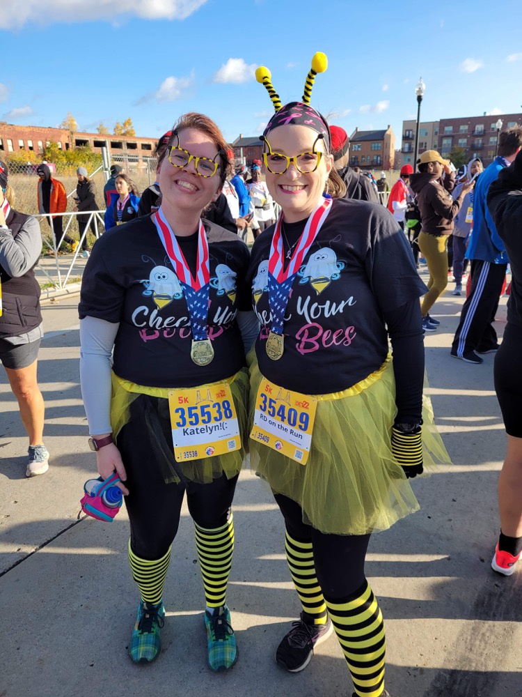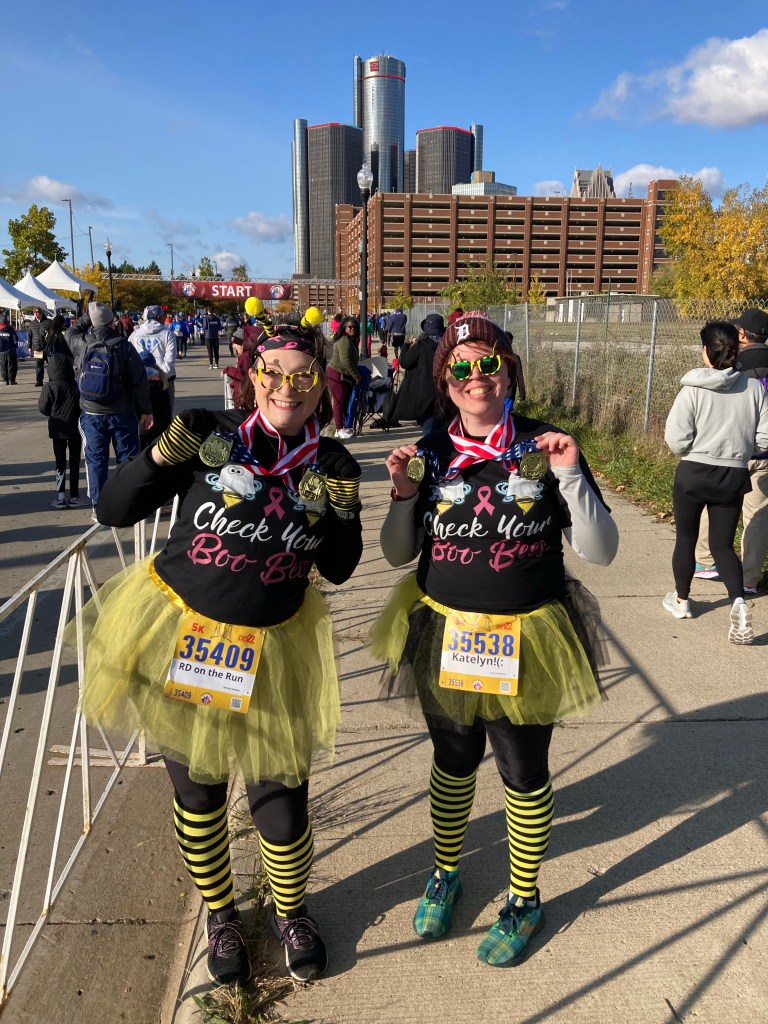 Saturday morning we woke up nice and early to drive downtown again for the 1 mile and 5k races. We found decent parking not too far from the start. While sitting in the car waiting to walk to the race, Katelyn noticed one of our friends from Saginaw in the car across from us. People started getting out of the cars and we realized that most of our group of friends from Saginaw were in the cars right across from us! We all got out and had a big reunion, chatted, and then made our way to the start area. Katelyn and I wore “Boo Bee” costumes for the race. We got tons of compliments on our costumes, a few strange looks, and the announcer REALLY liked our costumes. The races went well. We got to meet a couple of Instagram influencers that we follow and even got to take pictures with them. I felt a little bit star struck!