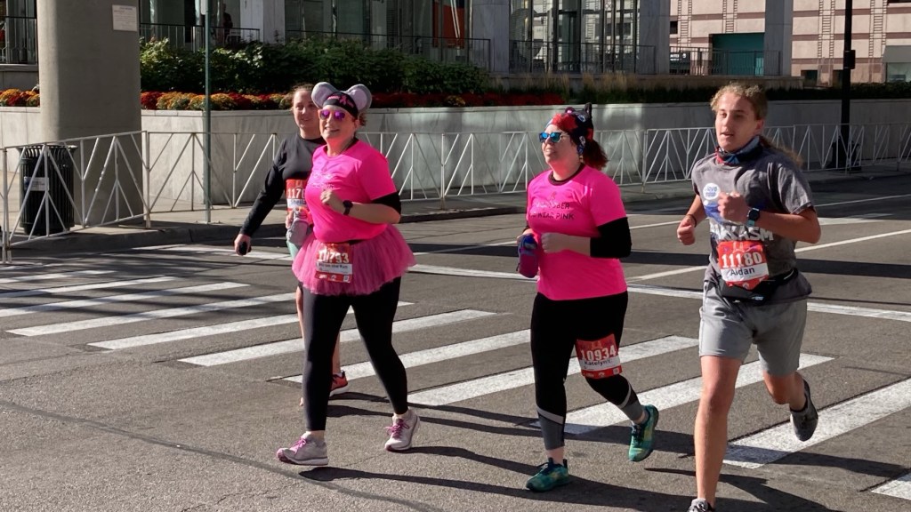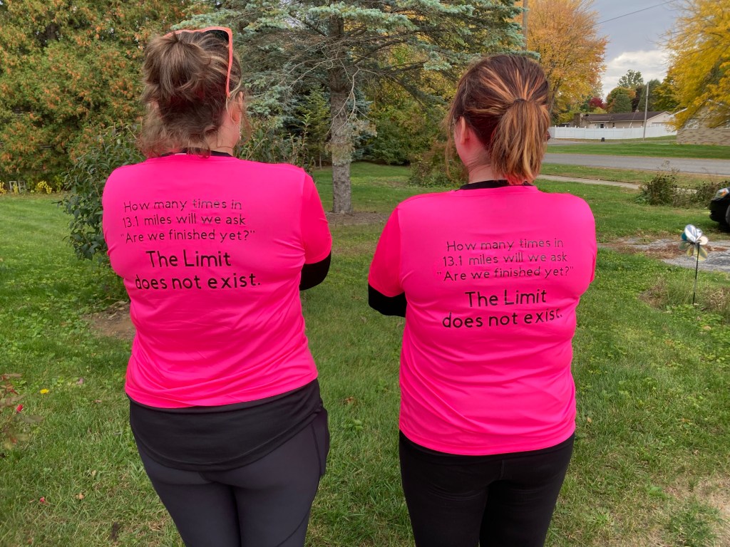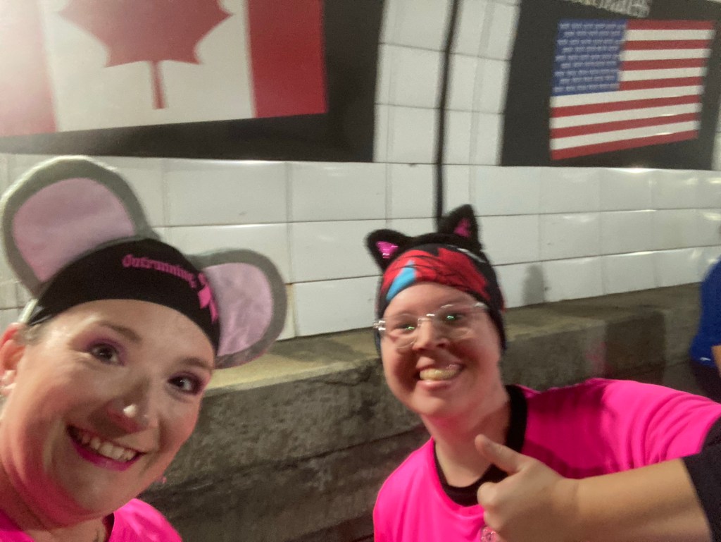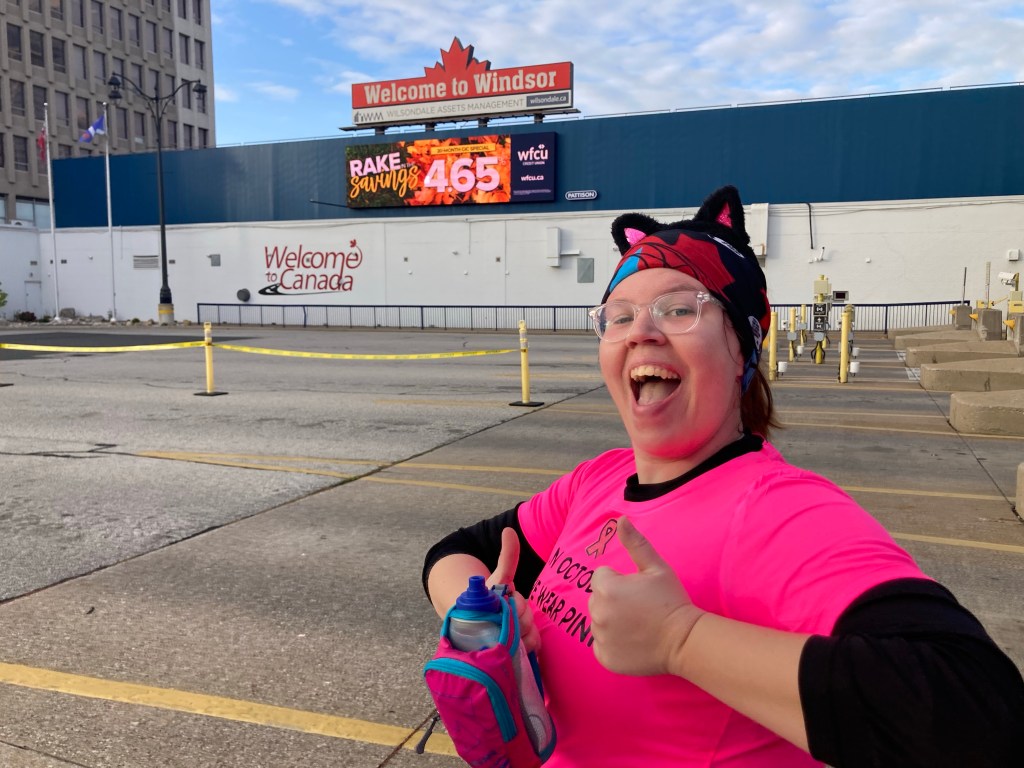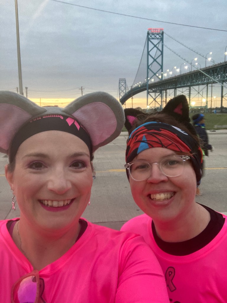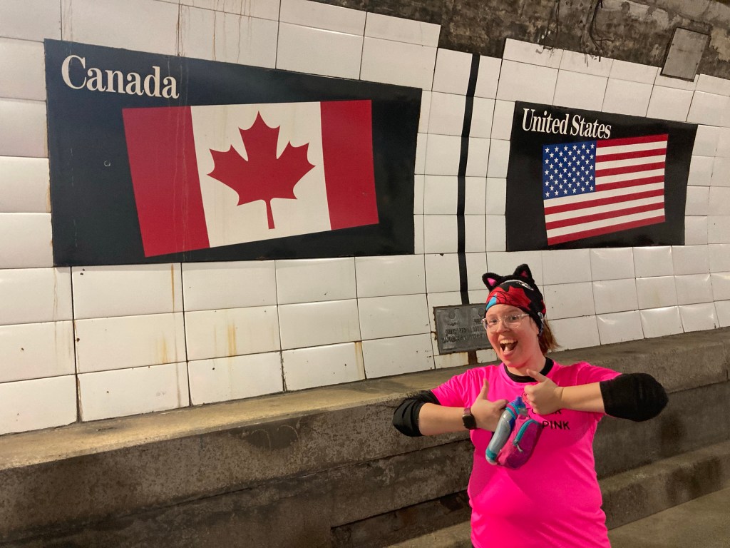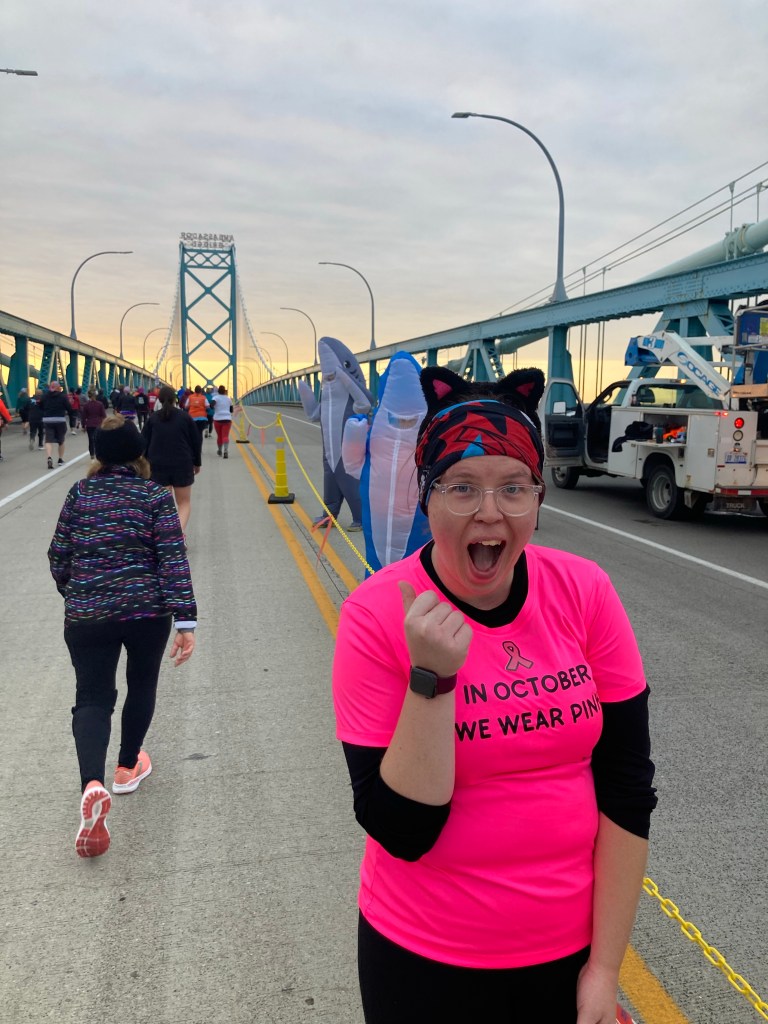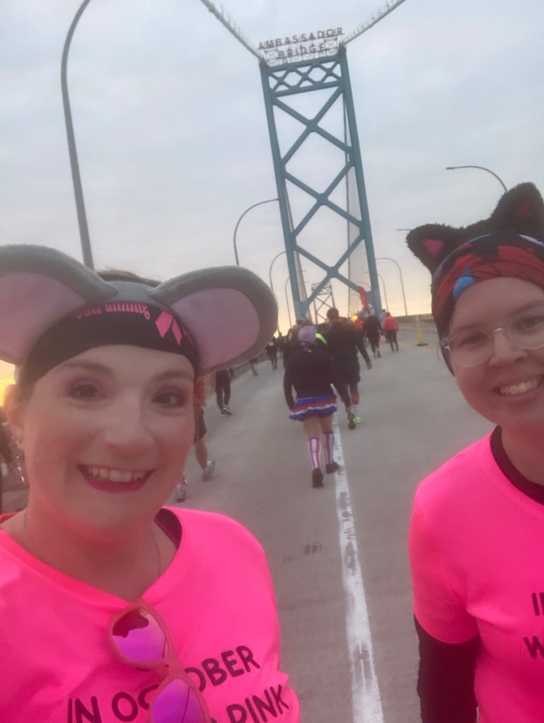 This was Katelyn’s first time running the international half, and it was so fun and exciting to finally be able to go back to Canada. Everything I remembered about loving this race was the same, and it was awesome to share that with my friend. For this race, we wore pink shirts for breast cancer awareness, and we had a nod to Mean Girls with what they said. The front of the shirts read “In October, We Wear Pink” and the back of the shirts read “How many times in 13.1 miles will we ask if we’re finished yet? The limit does not exist.” I wore mouse ears like Karen Smith from Mean Girls (I’m a mouse, duh!) and Katelyn channeled Gretchen Wieners with her cat ears. A few people caught on to what our costumes meant and told us they really liked them.