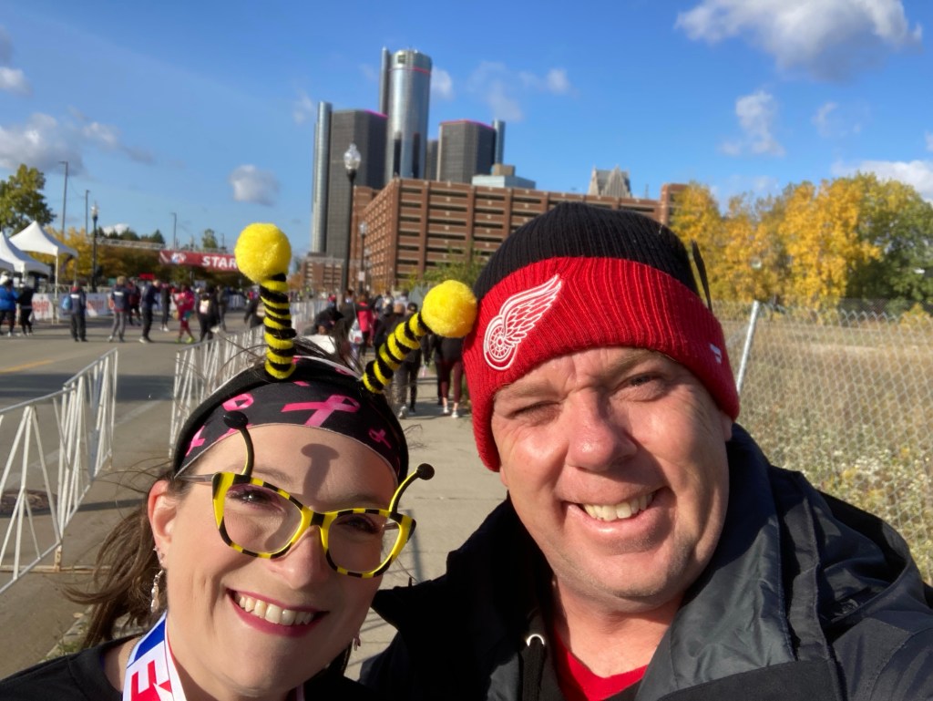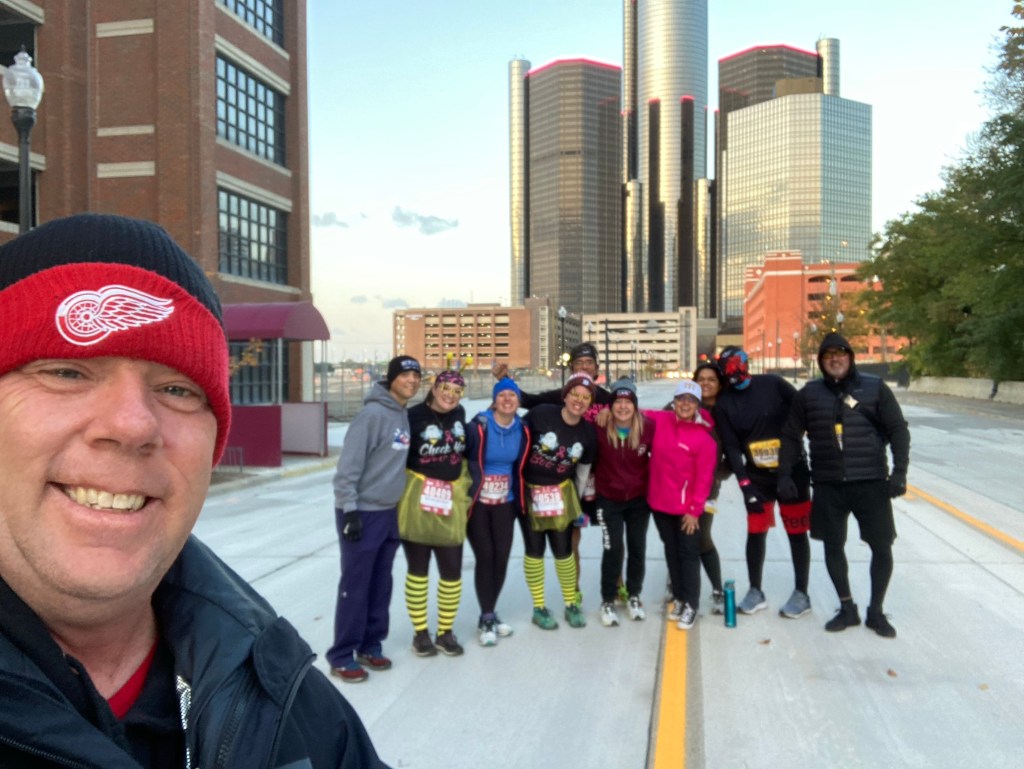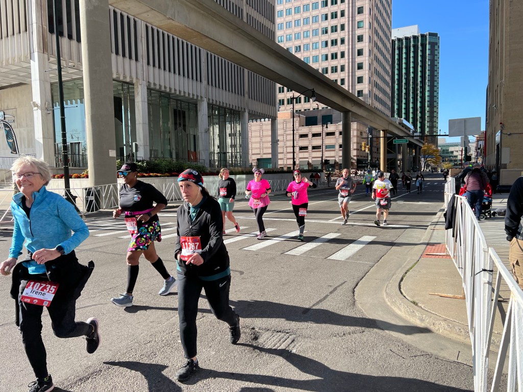 The new course for the half marathon was nice! I enjoyed running by Cobo (oops, I’m sorry, Huntington Place) after returning from Canada, because it wasn’t too far from the finish area so Ken was able to come see us. I didn’t love that we were seeing the finish area when we were still so far away from it. The course took us close to Little Caesars Arena and featured a couple of “out and back” portions where we were able to see some of our faster friends on the way out, and a few of our slower friends on the way back in.