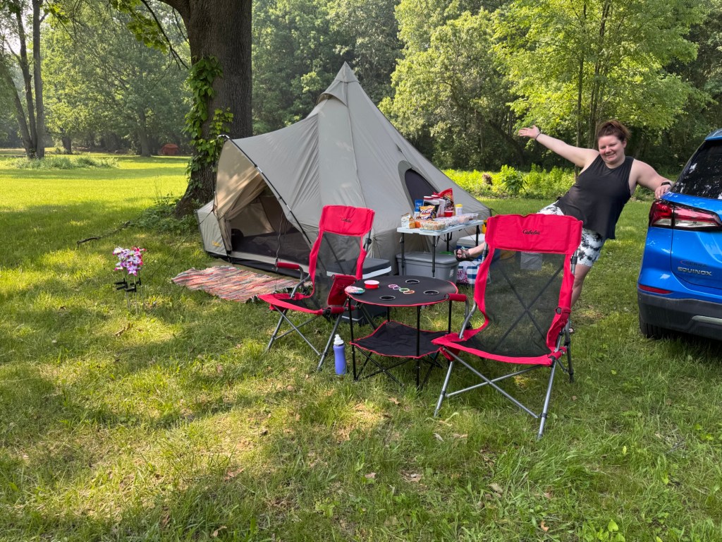 We rolled into camp on Friday afternoon and set up early. Things definitely looked different from when we’ve been to this location before for Run Woodstock. The main field near the start/finish was almost completely empty, so we found a prime spot between two trees for shade, not far from the start/finish. And we later realized that we were right at about the halfway mark of the two-mile loop we’d be running again and again. That meant we’d have a place to re-fuel at each mile.